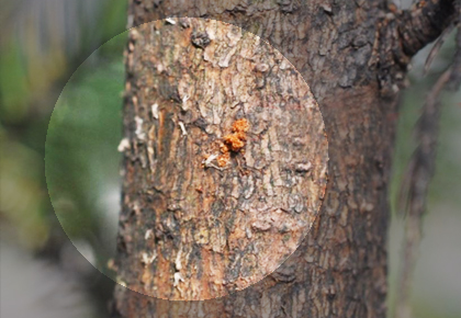 Harztröpfchen und Harzfluss am Stamm